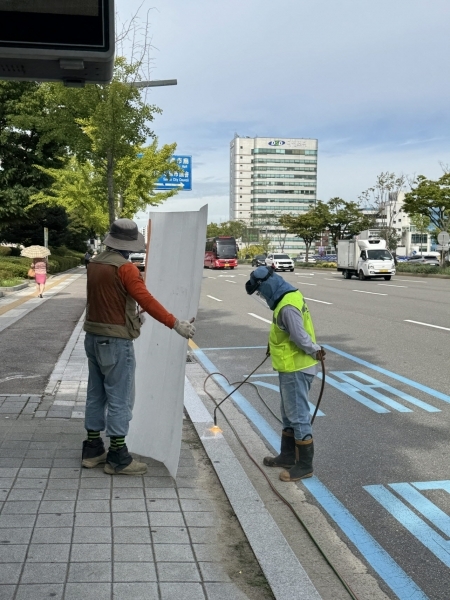 수원시청사거리~경기아트센터사거리 구간에 있는 화강암 경계석에 미끄럼 방지 시공을 하고 있다.