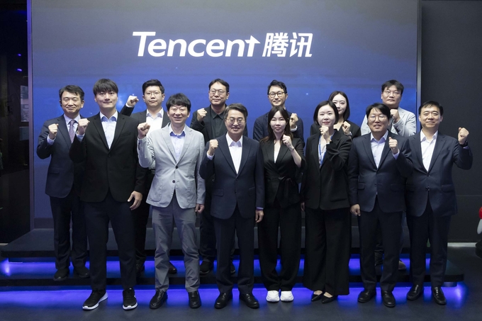 25일 상하이 텐센트 지사를 방문한 김동연 경기도지사와 경기도 AI 리더스 동행기업인들이 텐센트 관계자들과 기념 촬영을 하고 있다. [사진=경기도]
