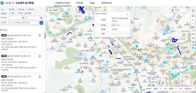 [정도일보 김현섭 기자] 안양시는 도로에서 진행되는 각종 공사 정보를 한눈에 파악할 수 있는 '도로 굴착 공사 현황 시스템(map.anyang.go.kr)'을 개발·운영하고 있다고 26일 밝혔다. 전국 최초라고 설명했다.