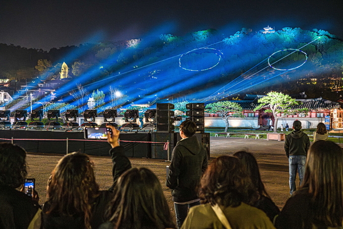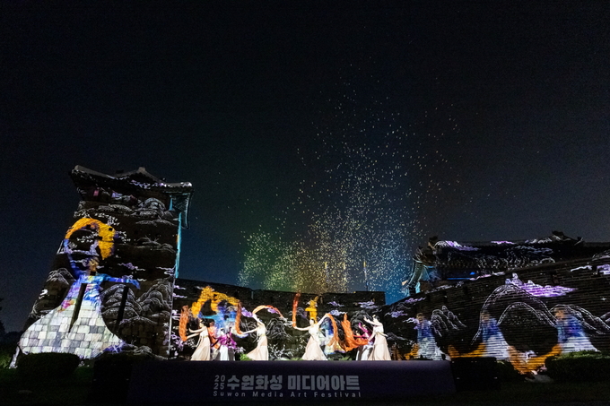 화서문 성벽에 2025 수원화성 미디어아트 메인 작품인 ‘새빛 향연’이 상영되고 있다.