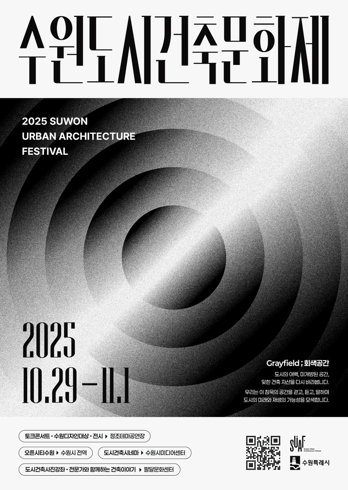 올해 수원도시건축문화제의 주제는 ‘Grayfield; 회색공간’이다. 미개방된 공간과 잊힌 건축 자산을 전문가와 함께 다시 바라보며 도시의 미래와 재생의 방향을 알아보는 행사다.
