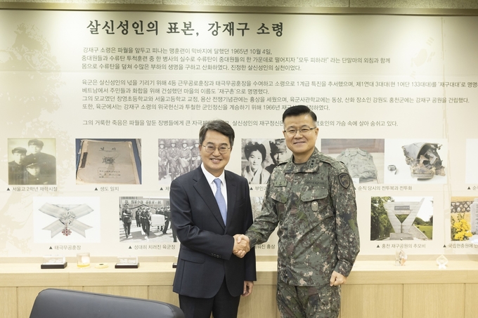 17일 가평 수도기계화보병사단을 방문한 김동연 경기도지사가 김성구 사단장과 악수를 나누고 있다. [사진=경기도]