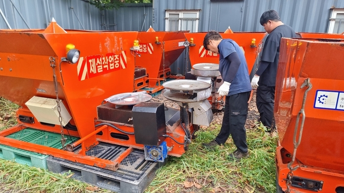 수원시 관계자가 제설제 살포 장비를 점검하고 있다.