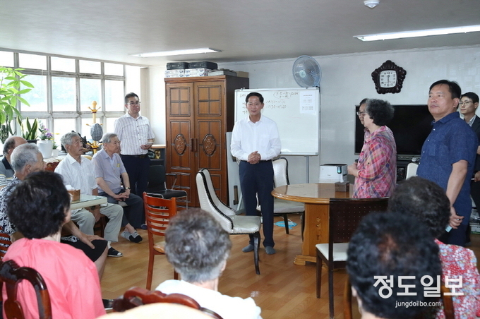 이번 방문은 경로당 시설점검과 연일 지속되는 폭염에 어르신들의 안부를 확인하기 위해 이뤄졌다. 이날 60여 명의 경로당 회원들과 점심식사와 다과를 함께 하며 경로당 운영상 불편사항과 시정에 관한 여러 의견들을 청취했다.