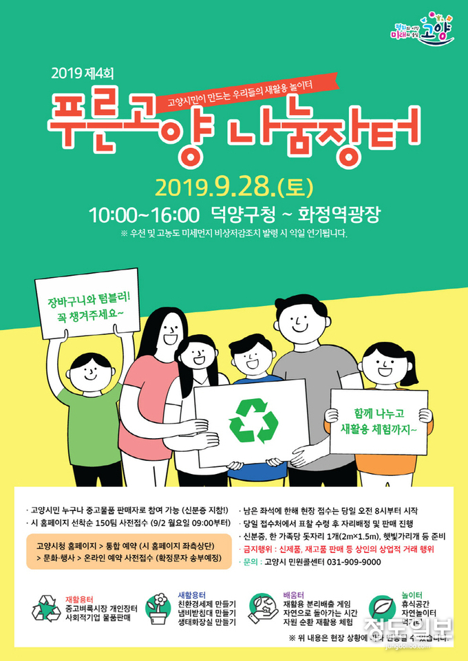 (정도일보) 고양시 덕양구는 오는 9월 28일 오전 10시부터 오후 4시까지 덕양구청에서 제4회 푸른고양 나눔장터를 개최한다.