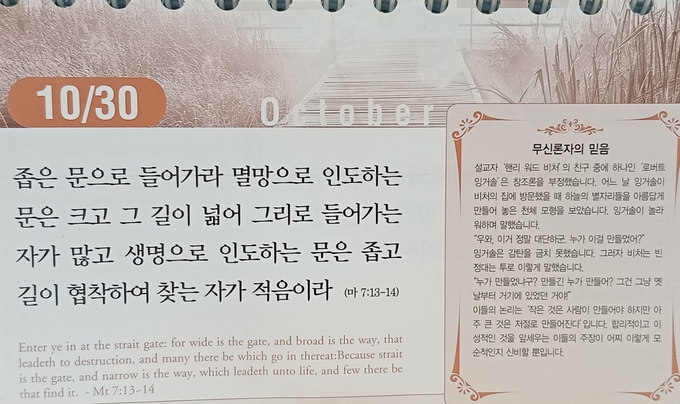 성도의 올바른 삶이 무엇인지 깊이 고민하던 남자가 있었습니다. 도저히 답을 찾을 수 없던 남자는 목사님을 찾아가 물었습니다. “목사님, 어떤 삶이 하나님의 진리를 따르는 삶입니까?” 목사님은 먼저 오늘 식사를 잘했는지 물었습니다. “네, 때에 맞춰 잘 먹었습니다.” 목사님은 다음으로는 직장에서 최선을 다했는지 물었습니다. “오늘 만나는 고객들에게 최선을 다했다고 자신 있게 말할 수 있습니다.”