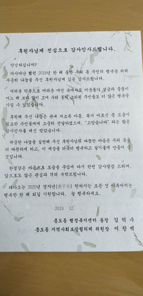 감사 서한에는 “어려운 여건 속에서도 이웃돕기 성금과 물품이 어느 해 보다 많이 모여 우리 동의 소외된 주민들이 더 많은 행복을 가질 수 있었으며 한결 같은 마음으로 도움을 주심에 감사드립니다”라는 내용을 담았다.
