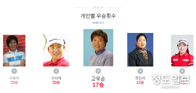 이밖에 고우순이 통산 17승으로 故구옥희와 신지애에 이어 3위에 자리하고 있고, 정길자와 장하나가 12승을 기록하며 공동 4위에 이름을 올렸다. 김미현과 서희경이 나란히 11승을 기록하며 뒤를 이었고, 강춘자, 고진영, 박성현이 통산 10승을 기록하며 두 자리 수 우승자 반열에 이름을 함께하고 있다.