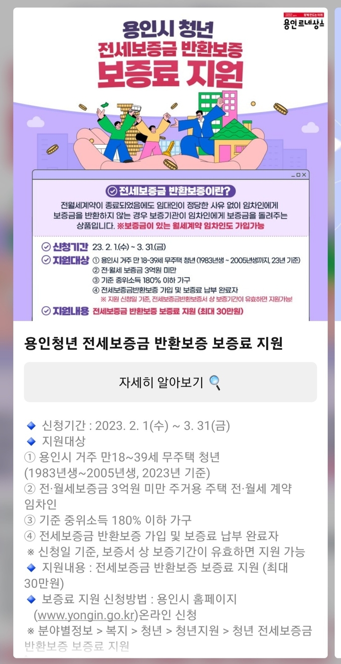 용인특례시는 청년 임차인들의 전세보증금 미반환 피해 예방을 위해 '용인청년 전세보증금 반환보증 보증료 지원사업'을 올해 새롭게 시작했다.