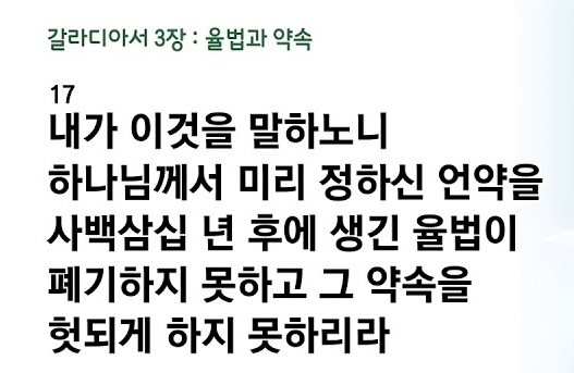 "내가 이것을 말하노니 하나님의 미리 정하신 언약을 사백 삼십년 후에 생긴 율법이 없이 하지 못하여 그 약속을 헛되게 하지 못하리라" -갈라디아서 3장17절