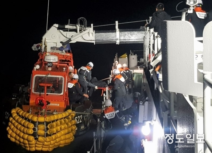 이에 완도해경은 경비함을 급파, 신고접수 16분 만에 청산도 인근해상으로 이동 후 고속단정 이용 오후 6시 14분경 환자와 보호자를 태운 후 경비함에 탑승시켜 27분만에 완도항에 도착하여 대기중인 119구조대에 안전하게 인계하였다.