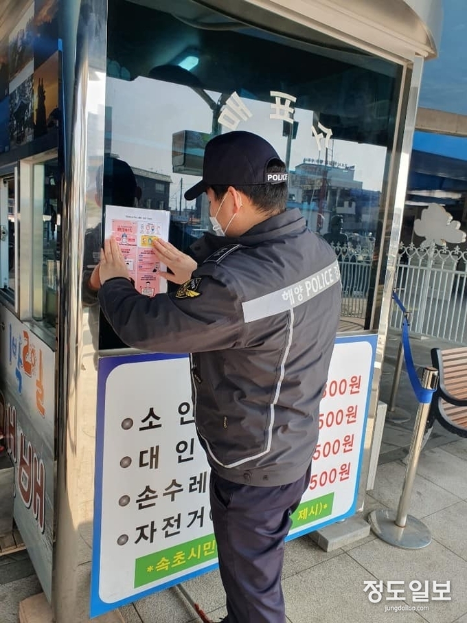 [정도일보 윤진성 기자]속초해경이 최근 12번째 감염 확진자의 강릉(주문진) 방문 기록과 관련, 동해안 일대의 낚시승객, 서퍼, 스쿠버 등 해양레저객과 외국인 선원 등 해양종사자들을 대상으로 코로나 감염 예방활동에 총력을 기울이고 있다.