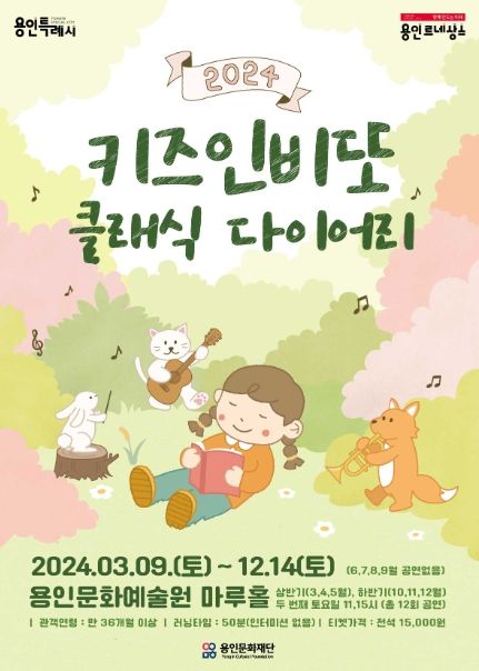 (정도일보) (재)용인문화재단은 상반기(3~5월), 하반기(10~12월) 두 번째 토요일마다 용인문화예술원 3층 마루홀에서 유·아동을 위한 클래식 상설공연 '2024 ‘키즈인비또’ 클래식 다이어리'를 개최한다.