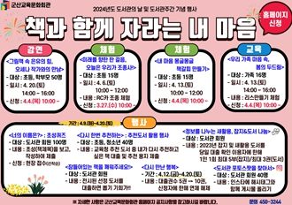 (정도일보) 군산교육문화회관은 제2회 도서관의 날 및 제60회 도서관주간을 기념하여 오는 4월 6일부터 4월 20일까지 '책과 함께 자라는 내 마음'행사를 운영한다.