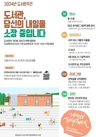 (정도일보) 충청남도서산교육지원청해미도서관은 제2회 도서관의 날과 제60회 도서관 주간을 맞아, 오는 4월 한 달간 다채로운 독서문화 행사를 운영한다.