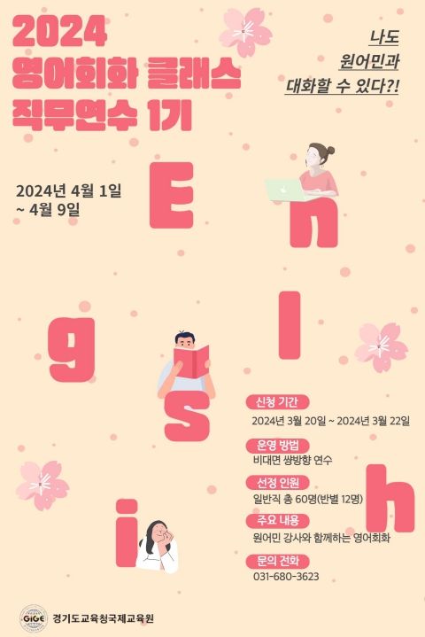 (정도일보) 경기도교육청국제교육원(원장 유혜영)이 다음달 1일부터 9일까지 도교육청 소속 일반직공무원 60여 명을 대상으로 영어 회화 연수‘영어 회화 클래스’1기를 운영한다.
