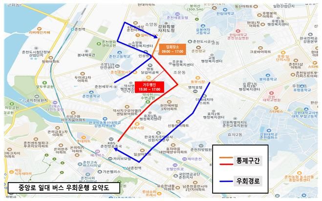 우회경로는 중앙로터리의 경우 인성병원 부터 서부시장 부터 춘천시청별관 방면으로 우회하며, 남부사거리를 경유하는 노선은 효자교 ~ 타워푸르지오A ~ 방송통신대 방면으로 우회한다.