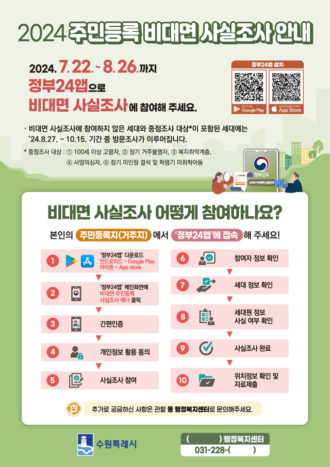 주민등록 사실조사는 비대면(정부24 앱) 또는 방문 조사 방식으로 한다. 비대면 조사는 8월 26일까지 시민이 직접 ‘정부24’ 앱에서 ‘주민등록 사실조사’에 접속해 사실조사 사항을 응답하는 방식이다. 이후 비대면 조사에 참여하지 않은 세대와 ‘중점조사 대상’ 세대를 방문해 대면조사를 한다.