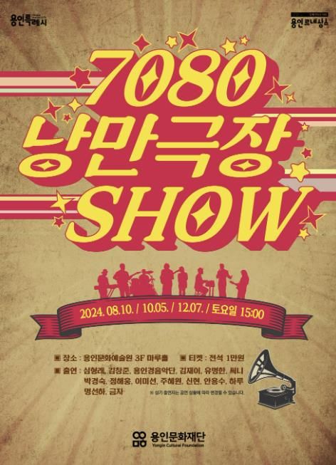 8월 10일 이번 주 토요일 용인문화예술원 마루홀에서 실버세대의 추억을 소환하는 버라이어티쇼 ‘7080 낭만 극장쇼’를 개최한다. 이번 공연은 여름 시즌 공연으로 80, 90년대 대한민국 개그계를 주름잡던 심형래의 센스 넘치는 유머와 5인조 용인경음악단의 라이브 음악 그리고 가수 김재이, 유명한, 써니, 박경숙이 출연하여 흥이 넘치는 신나는 노래를 선보이며 노래를 함께 배우고 불러보는 시간도 마련된다. 또한, 이번 여름 시즌 공연에 이어 10월 5일에는 가을 시즌, 12월 7일에는 겨울 시즌 공연이 계속될 예정이다.