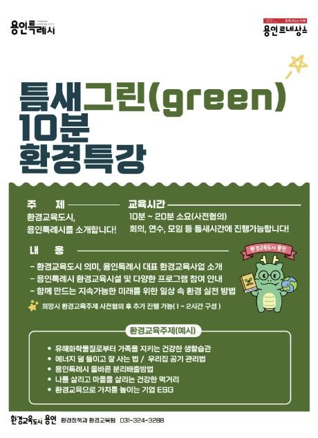 (정도일보) 용인특례시는 환경의 중요성과 일상생활 속 환경 실천 방법을 알리는 ‘찾아가는 틈새 그린 10분 환경 특강’을 운영한다고 16일 밝혔다.