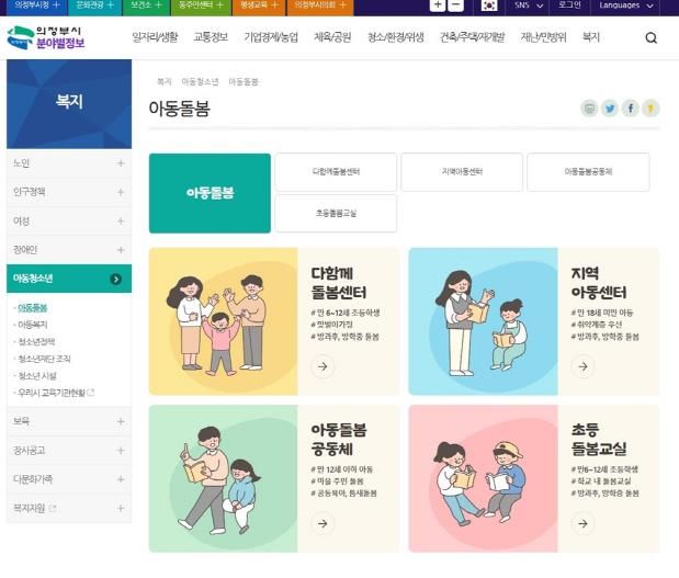 시청 누리집(홈페이지) 첫 화면의 생애주기별 서비스에서 아동청소년‧아동돌봄을 누르거나 상단 분야별정보 복지‧아동청소년‧아동돌봄을 눌러 확인할 수 있다.