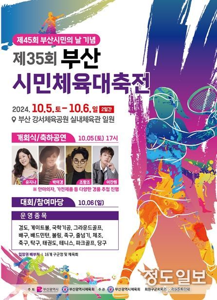 (정도일보) 부산시는 오는 5일부터 6일 이틀간 강서체육실내체육관 일원에서 부산 생활체육 동호인들의 최대 축제인 '제35회 부산시민체육대축전'을 개최한다고 밝혔다.