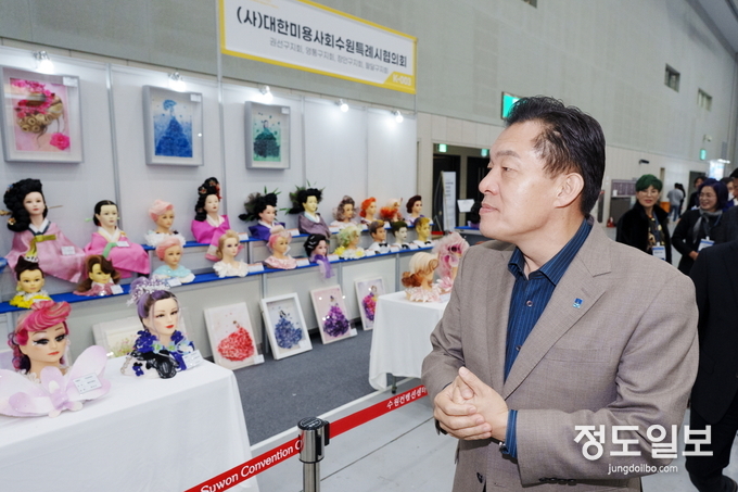 수원뷰티페스타 2023 행사장을 방문한 이재준 수원특례시장이 미용사들의 헤어아트 작품을 둘러보고 있다.