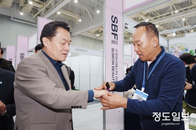 지난해 11월 수원뷰티페스타 2023 행사장을 방문한 이재준 수원특례시장이 참여 기업 부스를 방문해 상품을 발라보고 있다.