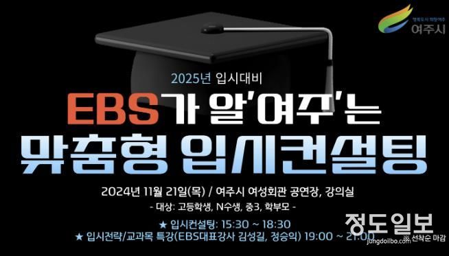 (정도일보) 여주시는 11월 21일, 여주시 여성회관 공연장 및 강의실에서 ‘EBS가 알‘여주’는 2025 맞춤형 입시컨설팅’을 개최한다고 밝혔다. 이번 입시컨설팅은 대한민국 대표 수능 전문 채널인 EBS와 여주시 청소년진로체험지원센터가 함께 손잡고 대학 입시를 앞둔 관내 수험생 및 학부모들의 여러 고민들을 함께 나누기 위해 마련되었다.