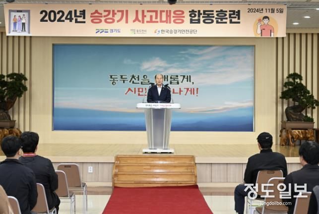 (정도일보) 동두천시가 5일, 동두천시청에서 지역자율방재단, 관내 아파트 관리사무소장, 동두천 사동 유치원 원아 등이 참관한 가운데 ‘2024년 승강기 사고 대응 합동훈련’을 실시했다고 밝혔다.
