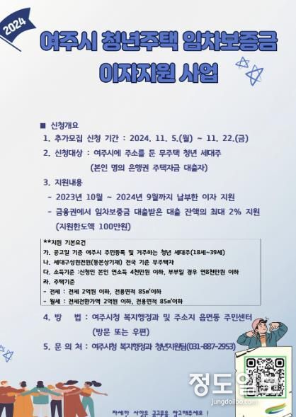 (정도일보) 여주시는 ‘2024년 청년 주택 임차보증금 이자 지원사업’의 신청 기간을 11월 22일까지 연장한다고 밝혔다. 이번 사업은 지난 10월 7일부터 신청을 받아온 것으로, 여주시에 주민등록이 되어 있는 만 18세부터 39세까지 청년 세대주 중 연 소득 4천만 원 이하의 무주택자를 대상으로 한다. 단, 기초생활보장 수급자와 공공임대주택 거주자는 지원 대상에서 제외된다.