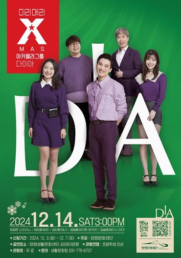 (정도일보) 양평문화재단은 12월 14일 토요일 15시, 양평생활문화센터 씨어터양평에서 정기공연 「별빛물빛 콘서트 in 양평」 '미리 메리 X-MAS'를 개최한다. 이는 올해 마지막 공연으로, 아카펠라 그룹 다이아가 무대에 오른다.