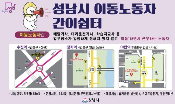현재 성남동에 운영 중인 거점형 쉼터와 달리, 역 주변에 설치된 간이쉼터는 접근성이 뛰어나 짧은 휴식이 필요할 때 유용하며, 혹한·혹서기 등 이동노동자들의 고충 해결과 열악한 노동 환경 개선에 기여할 것으로 기대된다.
