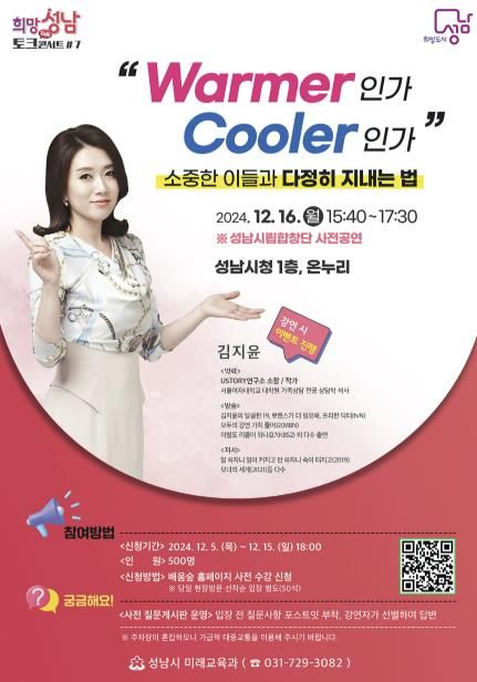 강연을 청취하려면 오는 12월 15일 오후 6시까지 성남시 평생학습 통합플랫폼 ‘배움숲’ 홈페이지를 통해서 참여 신청하면 된다.