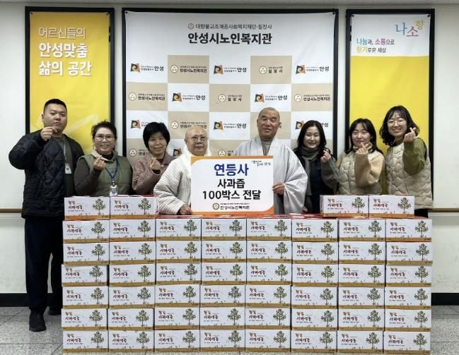 (정도일보) 안성시노인복지관은 안성 연등사로부터 지역사회 취약계층 어르신들을 위한 사과즙 100박스를 전달받았다고 9일 밝혔다.