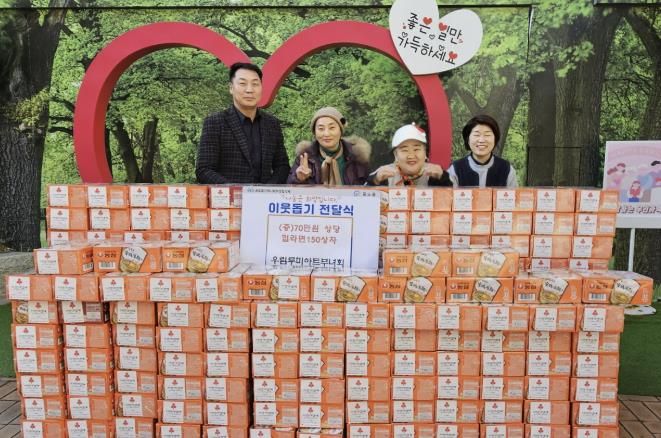 이춘희 회장은 “추운 겨울 한 끼 식사를 걱정하는 어려운 이웃에게 도움이 됐으면 좋겠다.”며, “부녀회 회원들의 따뜻한 마음이 라면과 함께 전달되길 바란다.”라고 말했다.
