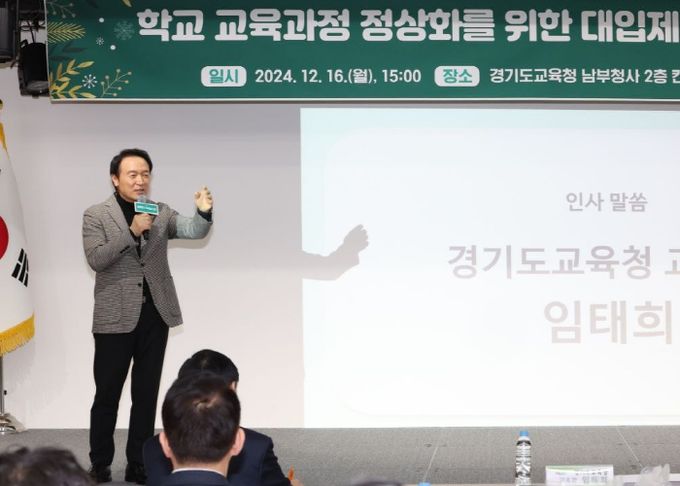 임태희 교육감은 인사말에서 “경기교육은 미래교육을 목표로 세우고 있다. 학생의 미래를 준비하기 위해 도와주는 것이 경기교육의 목표이자 지향점”이라면서 “그런 과정을 통해 아무리 필요한 교육을 하더라도 우리 현실은 대입제도에서 모든 왜곡이 생긴다. 미래교육 추진에 최종 장애물은 대입제도”라고 지적했다.