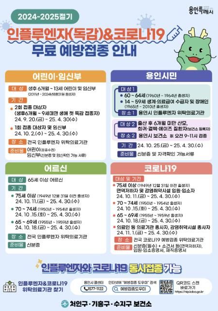 용인시민 중 ▲60~64세 ▲14~59세 의료 및 생계급여 수급자‧장애인은 위탁의료기관, ▲출산 후 6개월 산모 ▲희귀‧결핵‧에이즈 환자는 보건소에서 접종한다. 65세 이상 어르신은 코로나19와 인플루엔자(독감) 백신을 동시에 접종할 수 있다.