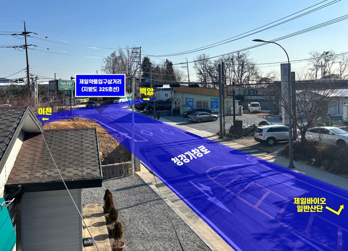 시는 이 구간을 오가는 차량이 편리하게 이동하도록 양방향 2차로를 3차로로 넓혀 청강가창로 안길에서 제일약품입구 삼거리 방향 우회전 전용 차로를 신설하고, 반대편엔 제일바이오 산단 방향 좌회전 차로를 만들었다. 보행 안전을 강화하기 위한 보도도 신설했다.