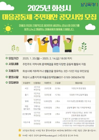 (정도일보) 화성특례시가 주민 주도의 마을문제 해결과 공동체 활성화를 위한 ‘2025년 마을공동체 주민제안 공모사업’ 참여자를 오는 13일부터 2월 14일까지 모집한다고 밝혔다.