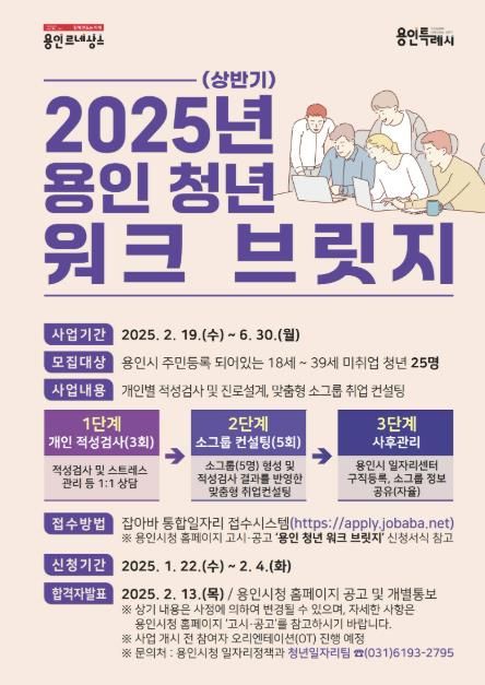 (정도일보) 용인특례시는 청년들의 진로 설계를 맞춤형으로 지원하는 ‘청년 워크 브릿지’에 참여를 희망하는 청년 구직자 25명을 모집한다고 22일 밝혔다.