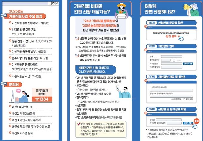 직불금 신청은 비대면과 대면 신청으로 나눠 진행된다. 비대면은 2월 1일부터 2월 28일까지 온라인 간편 신청으로, 대면은 3월 4일부터 4월 30일까지 농지소재지 동 행정복지센터를 방문해 신청할 수 있다.