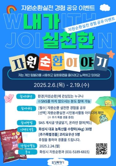 참여 방법은 재활용 분리배출, 플라스틱 사용 줄이기, 일회용품 사용 줄이기 등 일상에서 실천한 자원순환 활동 경험을 화성시 자원순환과 SNS 게시글에 댓글로 달거나 네이버폼으로 제출하면 된다.