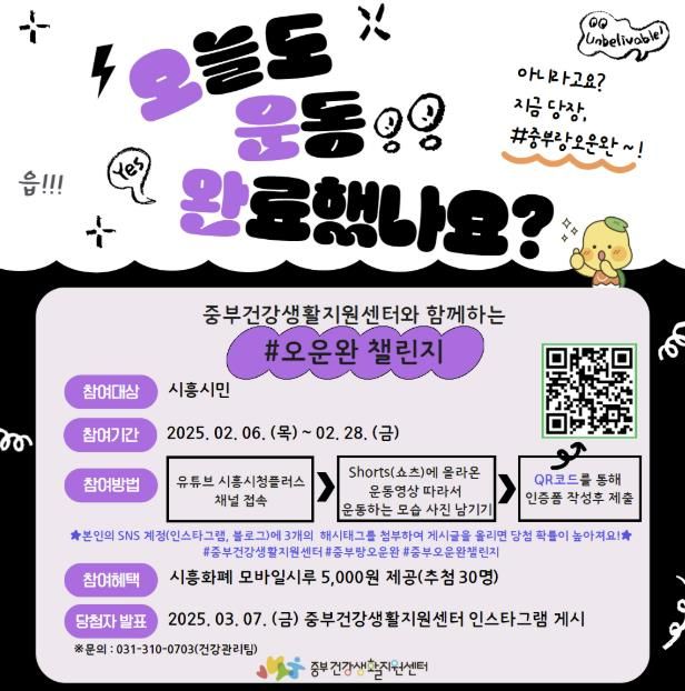 (정도일보) 시흥시 중부건강생활지원센터는 시민들의 건강증진을 위해 오는 2월 6일부터 28일까지 ‘오운완(오늘도 운동 완료) 챌린지’를 운영한다. 이번 챌린지는 시민들이 일상에서 쉽게 운동을 즐기고 건강한 습관을 형성할 수 있도록 돕기 위해 마련됐다.