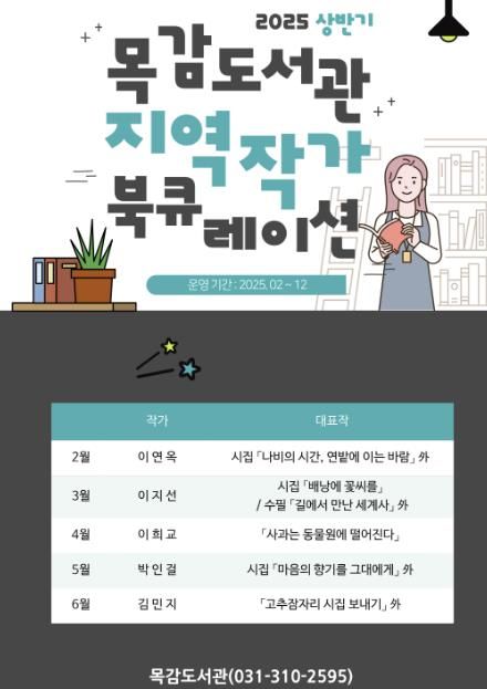 목감도서관에서 진행하는 지역작가 북 큐레이션 도서는 3층 종합자료실에서 누구나 자유롭게 열람하고 대출할 수 있으며, 2019년 개관 당시부터 조성된 3층 종합자료실 ‘시흥 문인 코너’에서는 시흥문인협회 지역작가들의 다양한 작품을 만날 수 있다.
