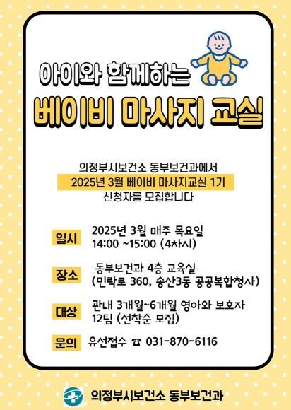 (정도일보) 의정부시 보건소는 3~6개월 영아와 보호자 12팀을 대상으로 ‘베이비 마사지교실’ 1기 참가자를 2월 17일부터 모집한다.