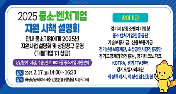 (정도일보) 화성특례시가 오는 17일 화성상공회의소 컨벤션홀에서 관내 중소·벤처기업인과 소상공인을 대상으로 ‘2025년 화성시 중소·벤처기업 지원 시책 설명회’를 개최한다.