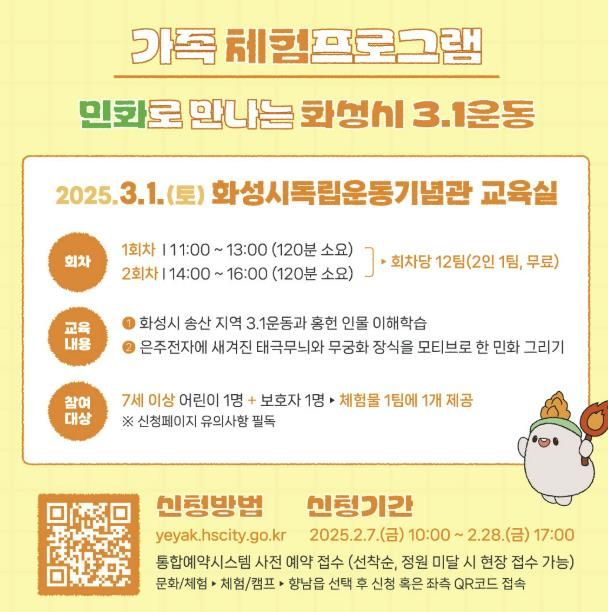 먼저, 가족 체험 프로그램 ‘민화로 만나는 화성시 3·1운동’이 진행된다. 참가자들은 송산 지역의 자선사업가 ‘홍헌’의 활동을 배우고, 이재민들이 그에게 선물한 은주전자와 은술잔에 새겨진 태극 문양과 무궁화 장식을 모티브로 민화를 그려보는 시간을 갖는다.