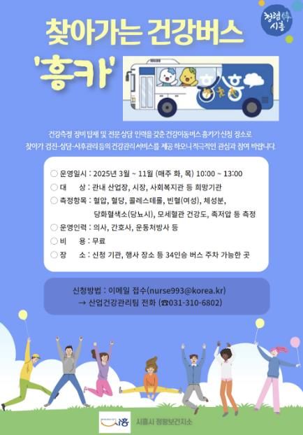 (정도일보) 시흥시는 2025년도‘찾아가는 건강버스 흥카’운영을 확대 시행한다. 이번 사업은 기존 산업장 근로자 중심에서 벗어나 전통시장 상인, 사회복지관 이용자, 외국인복지센터 방문자 등 일반 시민까지 대상을 넓혀 더욱 많은 시민이 건강검진과 상담을 받을 수 있도록 지원할 계획이다.