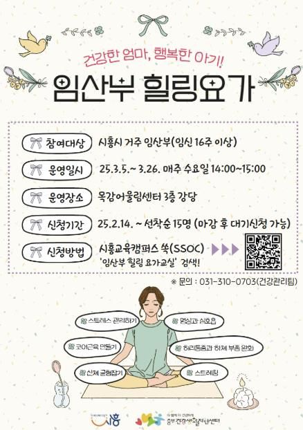 (정도일보) 시흥시 중부건강생활지원센터는 임산부의 신체적ㆍ정신적 건강 증진을 위해 3월 5일부터 26일까지 관내 임신 16주 이상의 임산부를 대상으로‘임산부 힐링 요가교실’프로그램을 운영한다.